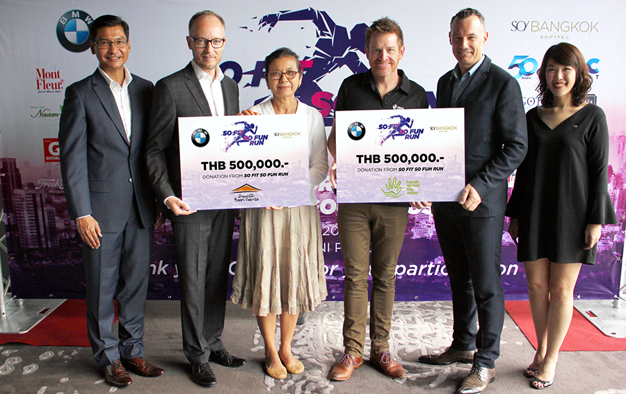 บีเอ็มดับเบิลยู กรุ๊ป ประเทศไทย นำโดย มร.ลาร์ส นีลเซ่น ผู้อำนวยการฝ่ายขายและการตลาด และคุณกฤษฎา อุตตโมทย์ ผู้อำนวยการฝ่ายสื่อสารกิจการองค์กร ร่วมกับ โรงแรมโซ โซฟิเทล แบงคอก นำโดย มร.ธอร์สเท่น ริชเทอร์ ผู้จัดการทั่วไป และ คุณนุสรา อร่ามเพียรเลิศ ผู้อำนวยการฝ่ายทรัพยากรบุคคล มอบเงินที่ได้จากการจำหน่ายบัตรเข้าร่วมงานวิ่งเพื่อการกุศลSO FIT SO Fun Run โดยไม่หักค่าใช้จ่าย รวมหนึ่งล้านบาท เพื่อร่วมสนับสนุนการดำเนินงานของมูลนิธิสิทธิเด็ก โครงการบ้านแกร์ด้า องค์กรการกุศลไม่แสวงหาผลกำไรซึ่งอุปถัมภ์ดูแลเด็กกำพร้าที่ติดเชื้อเอชไอวี และมูลนิธิ แฮนด์ อะครอส เดอะ วอเตอร์ (Hands Across The Water) มูลนิธิอุปถัมภ์เด็กด้อยโอกาส โดยมีคุณขวัญใจ สารสว่าง รองประธานมูลนิธิสิทธิเด็ก ผู้แทนบ้านแกร์ด้า และ คุณปีเตอร์ เบนส์ ผู้ก่อตั้งมูลนิธิแฮนด์ อะครอส เดอะ วอเตอร์ เป็นผู้รับมอบ งานวิ่งเพื่อการกุศล SO FIT SO Fun Run…