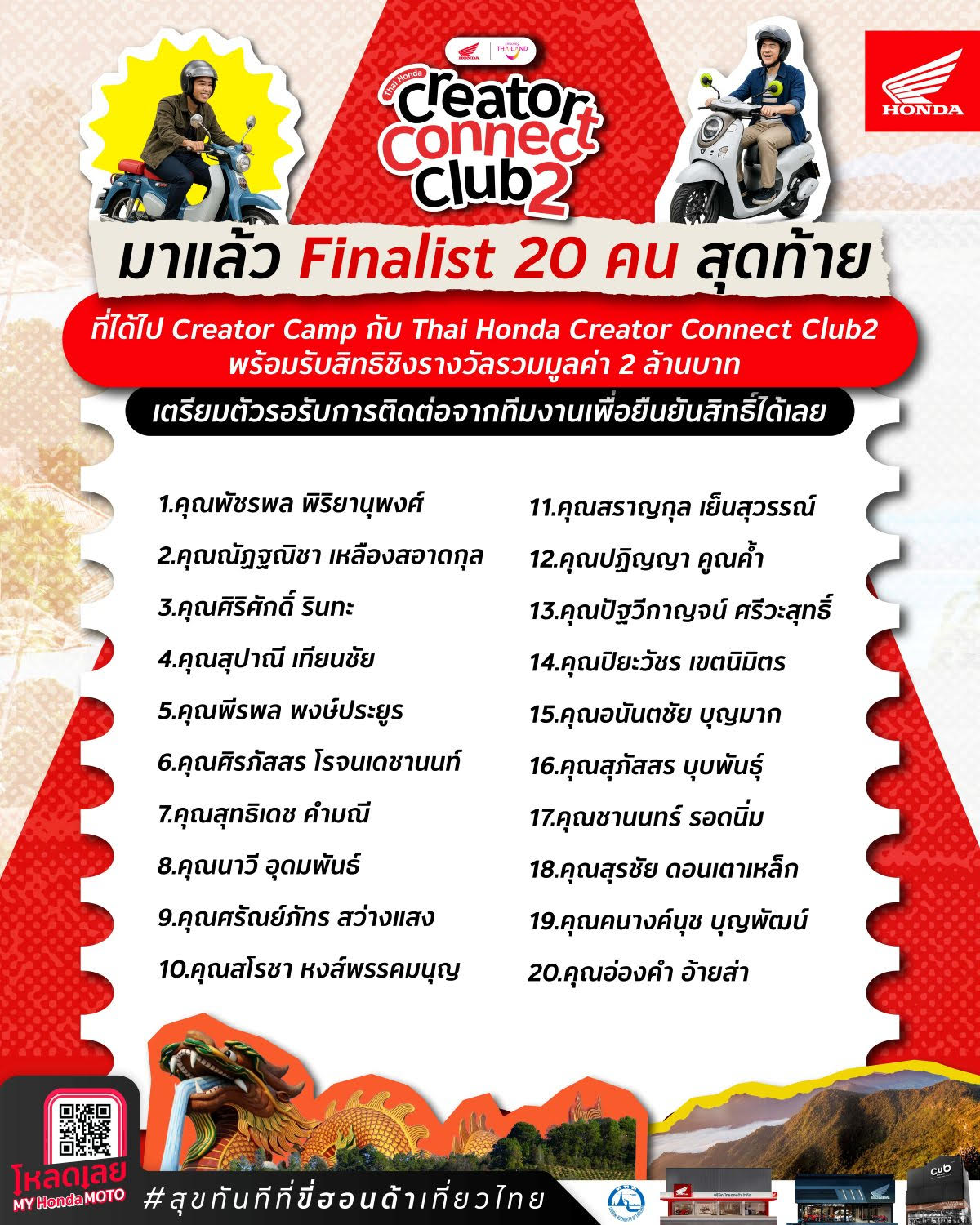 รถจักรยานยนต์ฮอนด้า ร่วมกับ การท่องเที่ยวแห่งประเทศไทย (ททท.) ประกาศรายชื่อ 20 ครีเอเตอร์ผู้ผ่านเข้ารอบสุดท้ายในแคมเปญ “Thai Honda Creator Connect Club 2 : สุขทันทีที่ขี่ฮอนด้าเที่ยวไทย” หลังได้รับการตอบรับอย่างคึกคักจากครีเอเตอร์ทั่วประเทศ โดยมีผลงานวิดีโอส่งเข้าร่วมกิจกรรมเกือบ 400 คลิป จากหลากหลายจังหวัดทั่วประเทศไทย สะท้อนถึงพลังของครีเอเตอร์รุ่นใหม่ในการถ่ายทอดเรื่องราวการท่องเที่ยวไทยผ่านมุมมองที่สร้างสรรค์และหลากหลาย ตลอดช่วงการเปิดรับสมัครที่ผ่านมา คอนเทนต์ที่ถูกส่งเข้ามาไม่เพียงแสดงให้เห็นถึงเสน่ห์ของแหล่งท่องเที่ยว วิถีชีวิต และวัฒนธรรมในแต่ละพื้นที่ แต่ยังมีส่วนช่วยกระตุ้นการรับรู้ด้านการท่องเที่ยว และสร้างการหมุนเวียนทางเศรษฐกิจในระดับท้องถิ่น ผ่านการเล่าเรื่องจากประสบการณ์จริงของผู้ขับขี่รถจักรยานยนต์ฮอนด้า ซึ่งเป็นพาหนะที่อยู่ใกล้ชิดกับชีวิตประจำวันของคนไทย ไทยฮอนด้าและ ททท. ขอขอบคุณครีเอเตอร์ทุกคนที่ร่วมเป็นส่วนหนึ่งของแคมเปญในครั้งนี้ โดยผลงานทุกคลิปช่วยขยายฐานผู้สื่อสารด้านการท่องเที่ยวไทย และเปิดพื้นที่ให้ครีเอเตอร์ท้องถิ่นได้แสดงศักยภาพ พร้อมสร้างแรงบันดาลใจให้เกิดการเดินทางท่องเที่ยวผ่านคอนเทนต์ที่เข้าถึงได้ง่ายและสร้างแรงบันดาลใจในการออกเดินทางเที่ยวทั่วไทยได้จริง สำหรับครีเอเตอร์ 20 คนสุดท้าย จะได้เข้าร่วม Thai Honda Creator Connect Camp ทริปสุดเอ็กซ์คลูซีฟ 3 วัน 2 คืน ที่เป็นกระบวนการพัฒนาครีเอเตอร์อย่างเข้มข้น ผ่านการเรียนรู้ใกล้ชิดกับครีเอเตอร์มืออาชีพ การลงพื้นที่ท่องเที่ยวจริง และการฝึกฝนทักษะการเล่าเรื่องผ่านการขี่รถจักรยานยนต์ฮอนด้า โดยผู้เข้าร่วมจะต้องร่วมทำ Assignment เพื่อเฟ้นหาผลงานที่สามารถถ่ายทอด “ความสุขจากการขี่ฮอนด้าเที่ยวไทย” ได้อย่างโดดเด่น และต่อยอดสู่การเป็นผู้ชนะของโครงการ คว้ารางวัลรวมมูลค่ากว่า 2 ล้านบาท รายชื่อผู้เข้ารอบสุดท้าย Thai…